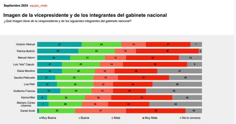 Otro ítem muy interesante del estudio es la consulta que involucra al gabinete nacional y la vicepresidente, Victoria Villarruel. De este amplio grupo, la de mejores imagen es justamente la compañera de fórmula de Milei. Villarruel cuenta con una imagen positiva en torno al 51%.