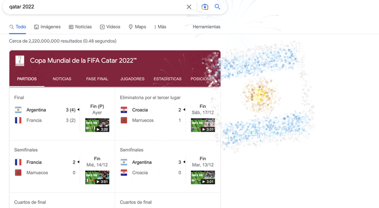 Y, como dato extra: si en este momento el lector se va a Google y escribe alguno de los términos mencionados, aparecerán fuegos artificiales que forman la bandera de Argentina para celebrar al nuevo campeón del mundo.