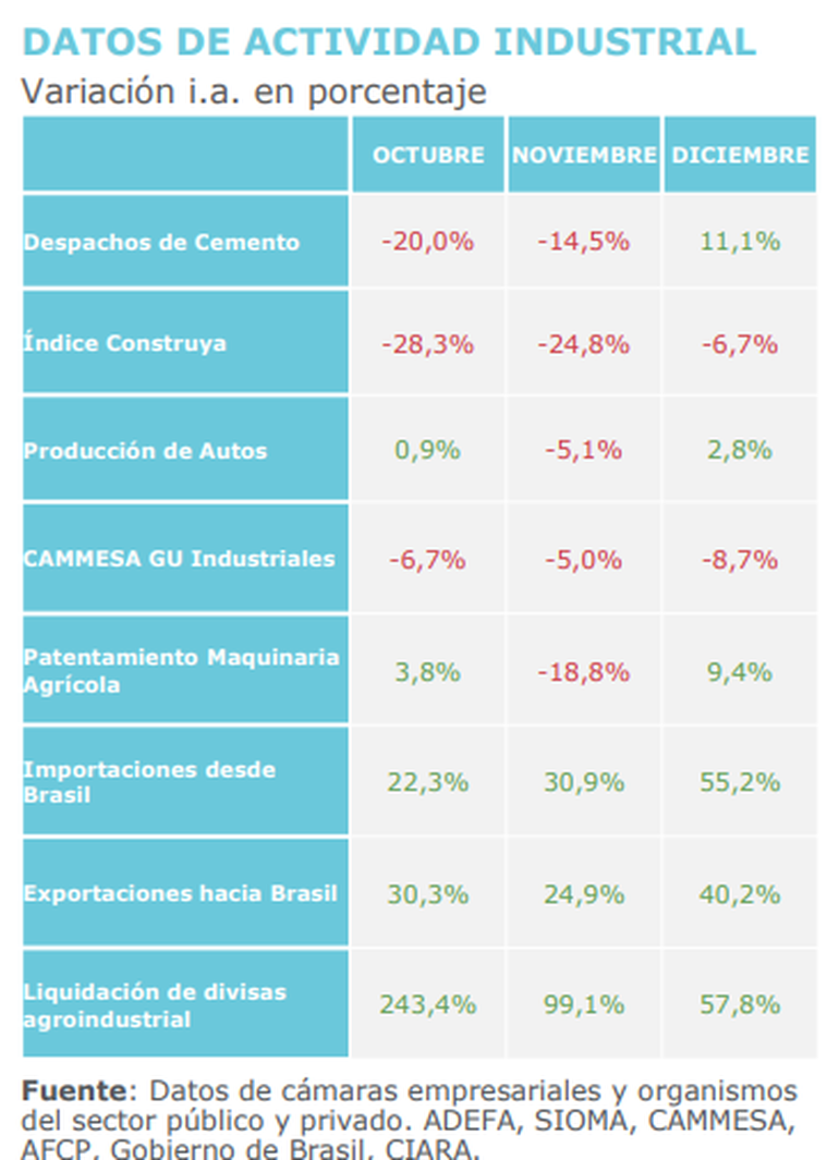 El reporte de la UIA indica que también crecieron las importaciones desde Brasil en un 55,2% interanual, mientras que en sentido inverso continuó en diciembre la baja interanual en el consumo de energía eléctrica de Grandes Usuarios Industriales en un 8,7% interanual.