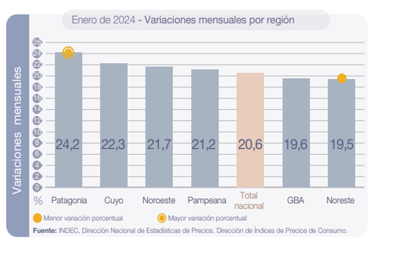En términos de regiones, la Patagonia fue el área de mayor incremento del costo de vida con el 24,2%, seguida por Cuyo, 22,3%; Noroeste, 21,7%; Pampeana, 21,2%; Gran Buenos Aires, 19,6% y Noreste,19,5%.