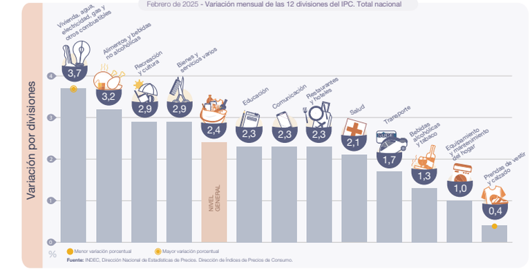 Las dos divisiones que registraron las menores variaciones en febrero de 2025 fueron Equipamiento y mantenimiento del hogar (1,0%) y Prendas de vestir y calzado (0,4%).
