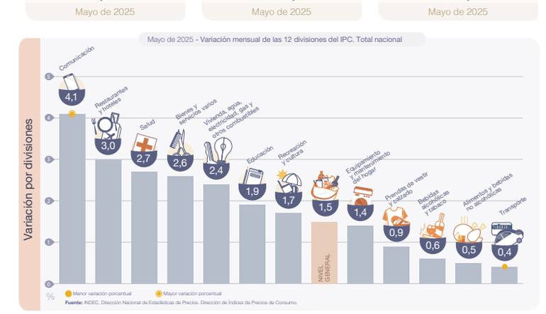 La división de mayor aumento en el mes fue Comunicación (4,1%), por subas en Servicios de telefonía e internet. Le siguió Restaurantes y hoteles (3,0%), por las alzas en Restaurantes y comidas fuera del hogar. En tanto, las dos divisiones que registraron las menores variaciones en mayo de 2025 con respecto al mes previo fueron Alimentos y bebidas no alcohólicas (0,5%) y Transporte (0,4%).