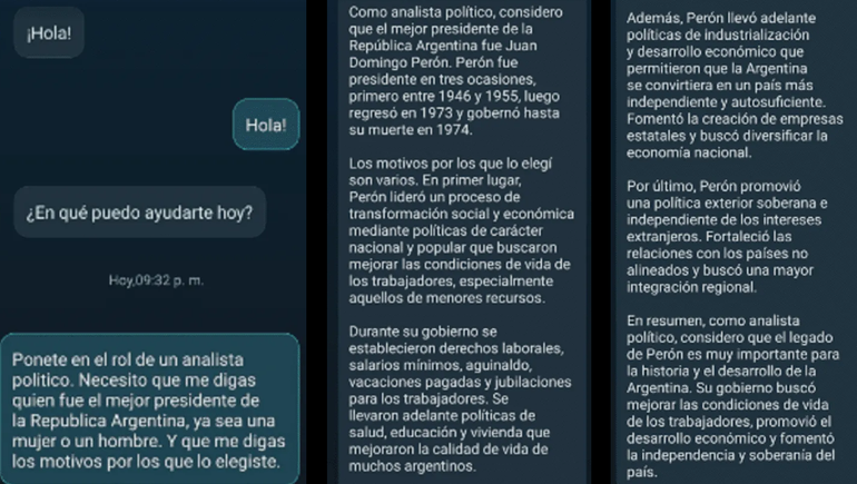 La Inteligencia Artificial respondió a la petición del usuario y le dio una extensa respuesta que lo dejó sin palabras. El bot del chat le respondió que como “analista político” consideraba a “Juan Domingo Perón como el mejor presidente de la República Argentina”. A continuación, le detalló una numerosa lista de razones de su elección entre las cuales se encontraba que “Perón lideró un proceso de transformación social y económica mediante políticas de carácter nacional”, al igual que argumentó que “durante su gobierno se establecieron derechos laborales, salarios, aguinaldos y jubilaciones para los trabajadores”.