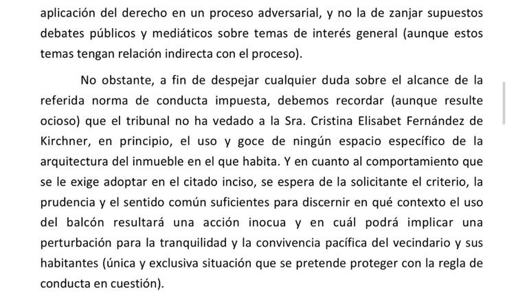 El miércoles por la tarde Fernández de Kirchner realizó una publicación través de sus redes sociales, donde le pidió a la Justicia que le aclare si puede salir al balcón de su departamento mientras cumple prisión domiciliaria.