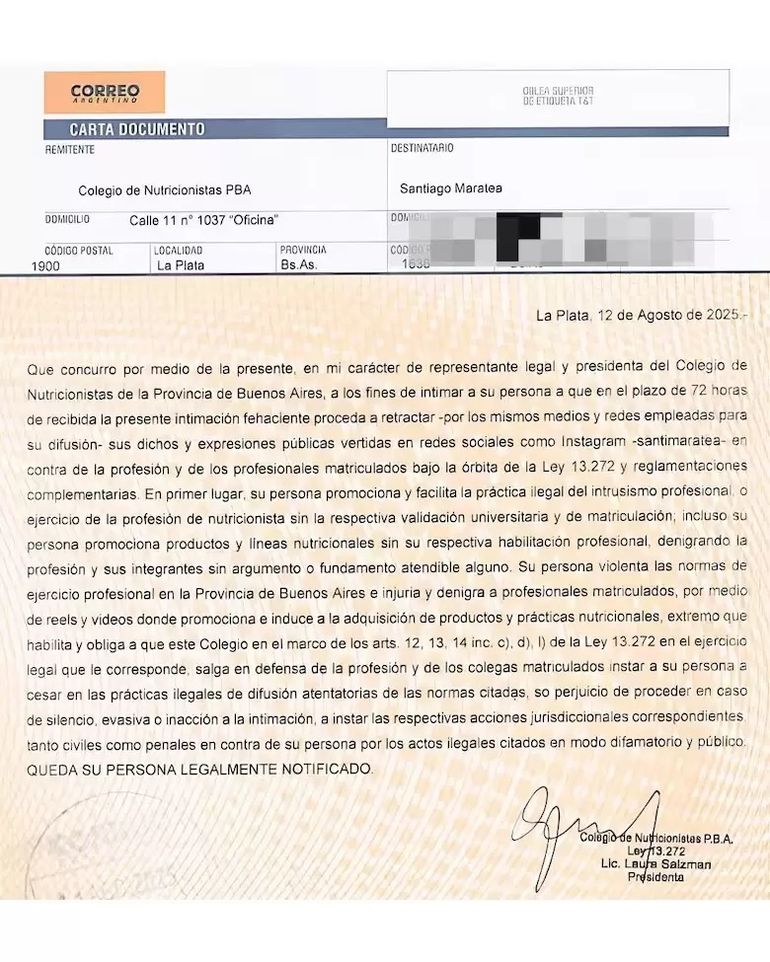 La denuncia fue presentada por el Colegio de Nutricionistas de la Provincia de Buenos Aires, que lo acusa de difundir consejos alimentarios sin poseer el título habilitante y de promocionar productos dietéticos sin aval profesional, prácticas que -según remarcan- ponen en riesgo la salud pública.