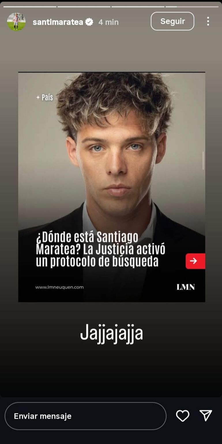 Por el momento, el influencer tampoco emitió alguna respuesta contundente en sus redes sociales sobre la situación judicial que atraviesa. De igual manera, compartió un posteo de LMNeuquén junto a un "jajajaja" que hace alusión a la búsqueda de su paradero.
