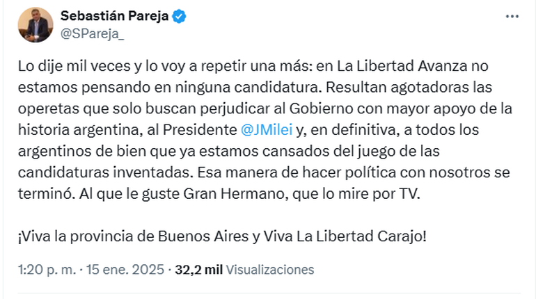 El primero en aclarar la situación fue el armador bonaerense Sebastián Pareja, del círculo rojo de la secretaria general de la Presidencia, Karina Milei, quien a través de sus redes sociales afirmó: "Lo dije mil veces y lo voy a repetir una más: en La Libertad Avanza no estamos pensando en ninguna candidatura".