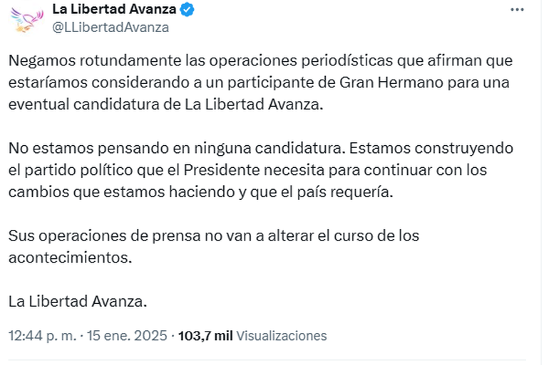 Desde la cuenta de X de La Libertad Avanza también se encargaron de rechazar la posibilidad. "Negamos rotundamente las operaciones periodísticas que afirman que estaríamos considerando a un participante de Gran Hermano para una eventual candidatura de La Libertad Avanza", subrayaron.