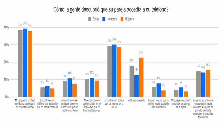 De los encuestados que sospechan que su pareja ha tenido acceso a su teléfono sin su consentimiento, 39% dijo que su pareja confesó el acto, 29% sorprendió a su pareja “con las manos en la masa”, y 15% dijo que su pareja sabía cosas que ellos habían compartido privadamente a través de su teléfono.