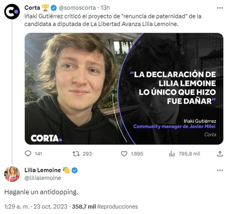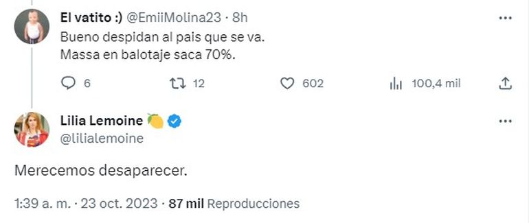 Minutos después, cuando un usuario la acusó de haber ocasionado la derrota de La Libertad Avanza con sus declaraciones, Lemoine se defendió y blanqueó la interna en el espacio libertario.
