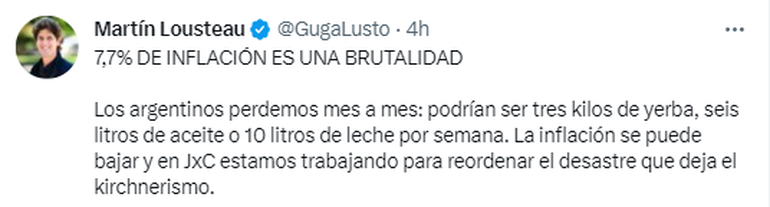 Finalmente, el senador nacional y precandidato a jefe de Gobierno porteño Martín Lousteau enfatizó que un "7,7% de inflación es una brutalidad".