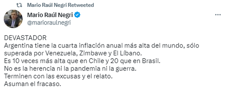 "Es 10 veces más alta que en Chile y 20 que en Brasil. No es la herencia ni la pandemia ni la guerra. Terminen con las excusas y el relato. Asuman el fracaso", afirmó el cordobés.