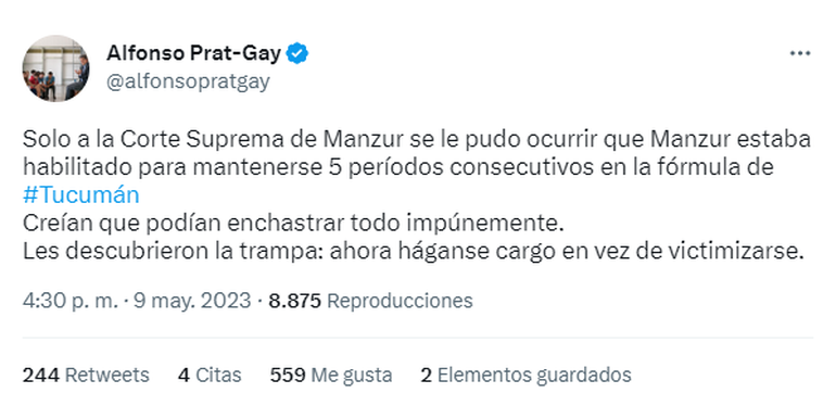 Luego de la decisión de la Corte Suprema, el exministro de Hacienda, Alfonso Prat-Gay, señaló al Máximo Tribunal a nivel provincial y opinó: “Solo a la Corte Suprema de Manzur se le pudo ocurrir que Manzur estaba habilitado para mantenerse 5 períodos consecutivos en la fórmula de Tucumán”.