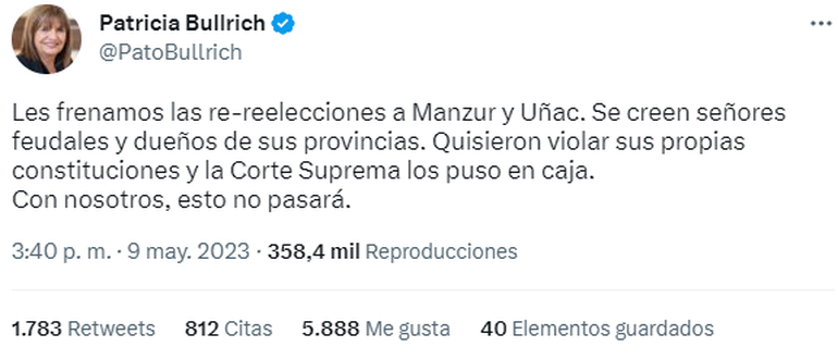 En ese sentido, la precandidata a presidenta de la Nación por Juntos por el Cambio (JxC), Patricia Bullrich, lanzó: “Les frenamos las re-reelecciones a Manzur y Uñac. Se creen señores feudales y dueños de sus provincias. Quisieron violar sus propias constituciones y la Corte Suprema los puso en caja. Con nosotros, esto no pasará”.