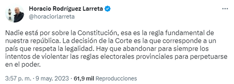A continuación agregó que “la decisión de la Corte es la que corresponde a un país que respeta la legalidad. Hay que abandonar para siempre los intentos de violentar las reglas electorales provinciales para perpetuarse en el poder”.