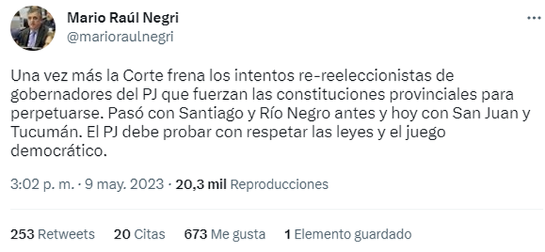 Uno de los primeros en hacerlo fue Mario Negri, presidente del Bloque UCR en la Cámara de Diputados, quien escribió: “Una vez más la Corte frena los intentos re-reeleccionistas de gobernadores del PJ que fuerzan las constituciones provinciales para perpetuarse. Pasó con Santiago y Río Negro antes y hoy (martes) con San Juan y Tucumán. El PJ debe probar con respetar las leyes y el juego democrático”.