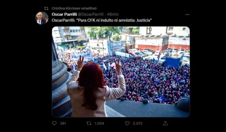 Cristina Fernández de Kirchner compartió durante la noche del miércoles un tuit del senador Nacional, Oscar Parrilli: “Para CFK ni indulto ni amnistía: Justicia”. El mensaje fue compartido minutos antes a que el presidente Alberto Fernandez estuviera en el programa periodístico de Todo Noticias (TN), A Dos Voces.