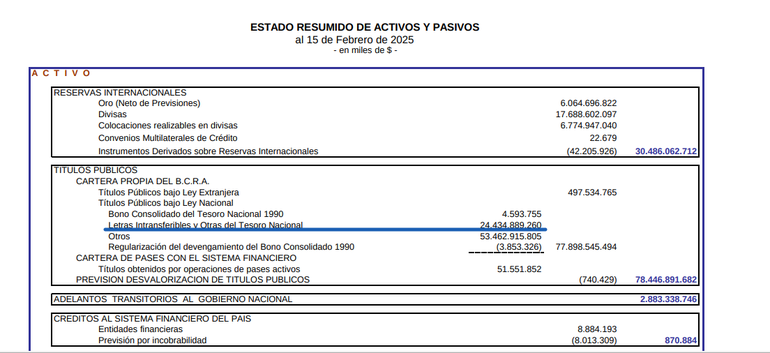 Según indica en su último balance semanal el Banco Central, en su activo cuenta con el equivalente a unos u$s24.000 millones en letras intransferibles. El origen de ello se remonta a 2010, cuando era presidente del BCRA Martín Redrado. En ese momento la presidenta era Cristina Fernández, quien le había ordenado entregar dólares de las reservas, abundantes gracias al período de soja cara. Es de recordar que el economista se negó y fue echado del cargo.