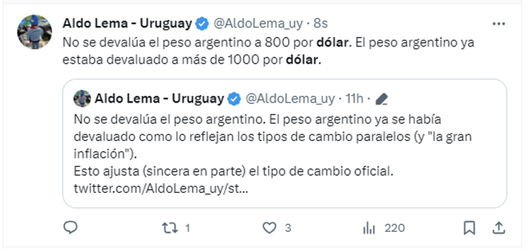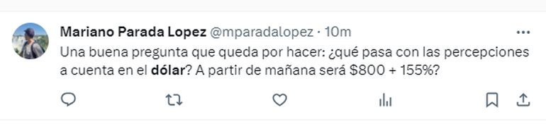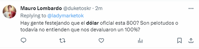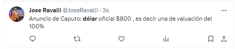 Luego de una larga espera, el ministro de Economía, Luis Caputo, anunció que el dólar oficial se comercializará a 800 pesos. Entre algunas sorpresas y asombros, los argentinos utilizaron la red social X (antes conocida como Twitter) para plasmar su reacción.