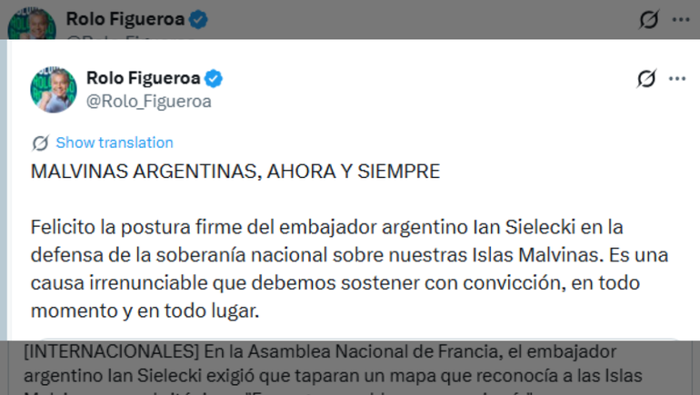 "MALVINAS ARGENTINAS, AHORA Y SIEMPRE. Felicito la postura firme del embajador argentino Ian Sielecki en la defensa de la soberanía nacional sobre nuestras Islas Malvinas. Es una causa irrenunciable que debemos sostener con convicción, en todo momento y en todo lugar", escribió el gobernador neuquino en su cuenta de X.