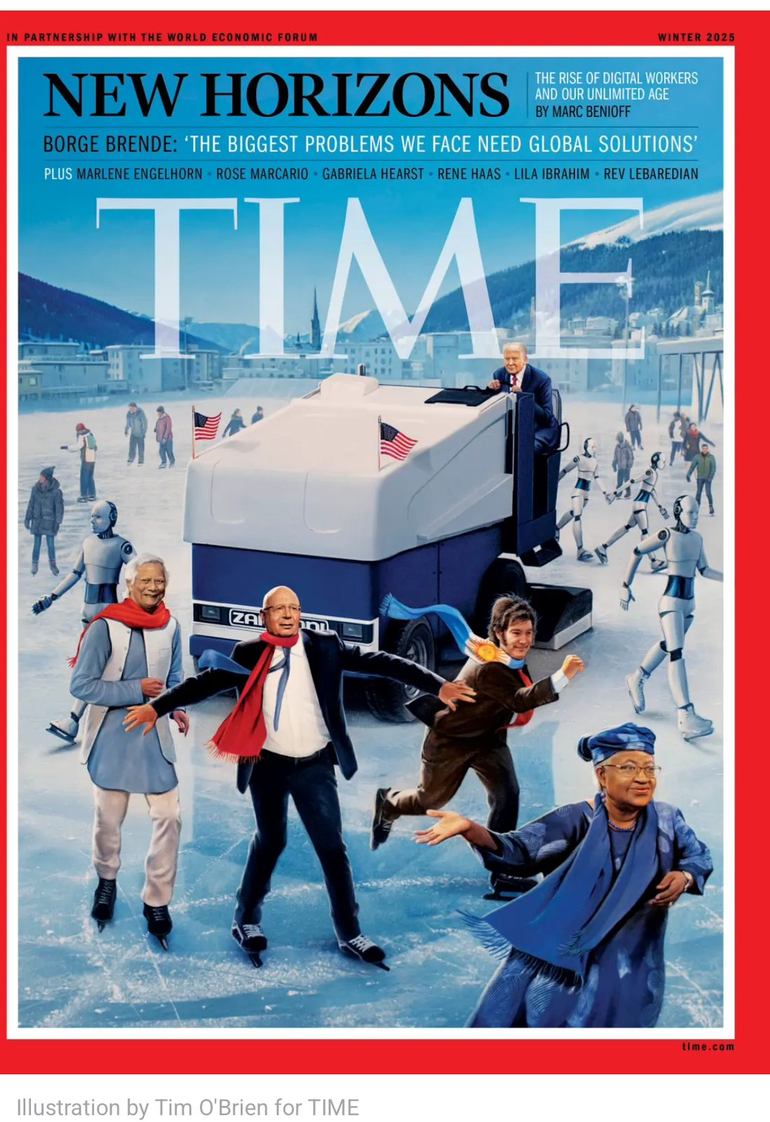 La imagen de portada de la tradicional revista norteamericana es una ilustración en la que aparece Milei junto al presidente electo de Estados Unidos, Donald Trump; el presidente del Foro Económico Mundial, Klaus Schwab; el premio Nobel bangladesí Muhammad Yunus; y Ngozi Okonjo-Iweala, economista y directora de la Organización Mundial del Comercio.