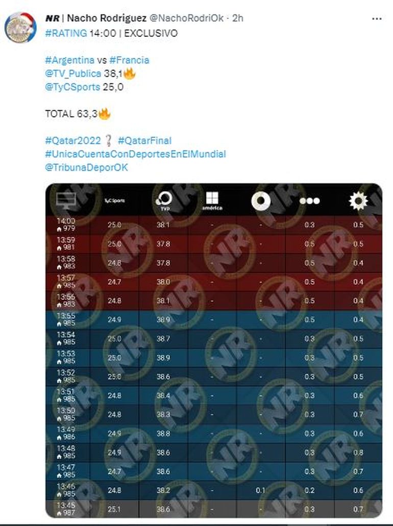 En la final del Mundial de 2018 que enfrentó a Francia con Croacia, la TV Pública tuvo un promedio de 30.8, mientras que TyC anduvo por los 13 puntos.