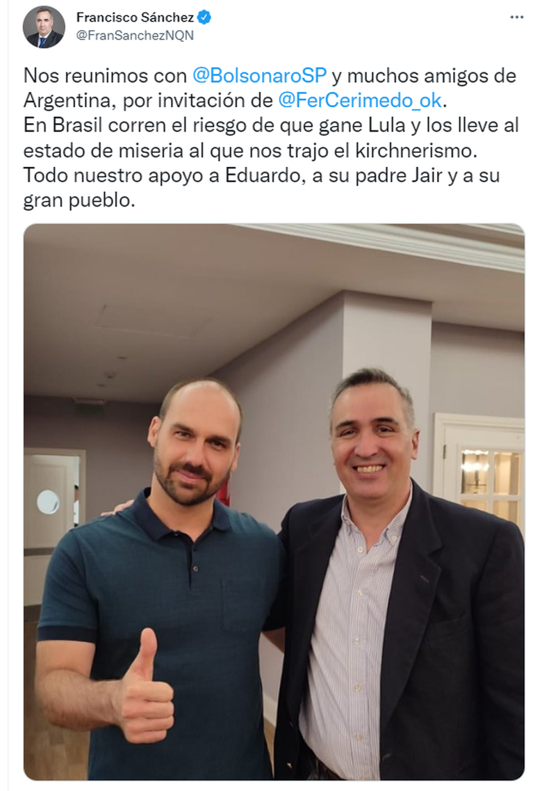 Finalmente, Eduardo Bolsonaro destacó su encuentro con dirigentes políticos alineados con Patricia Bullrich y Miguel Pichetto, entre ellos el diputado neuquino Francisco Sánchez, y también de La Libertad Avanza, el espacio de Javier Milei y señaló que se reunió con "la unión de los políticos de Argentina", a los que observa por sus "valores sociales".
