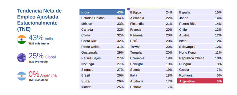 Los empleadores argentinos son los menos dispuestos a contratar nuevo personal de un conjunto de 41 países relevados. Estan en el ultimo lugar de la tabla. En el podio está India con 43 puntos,seguida por Estados Unidos, 34 y México 33.