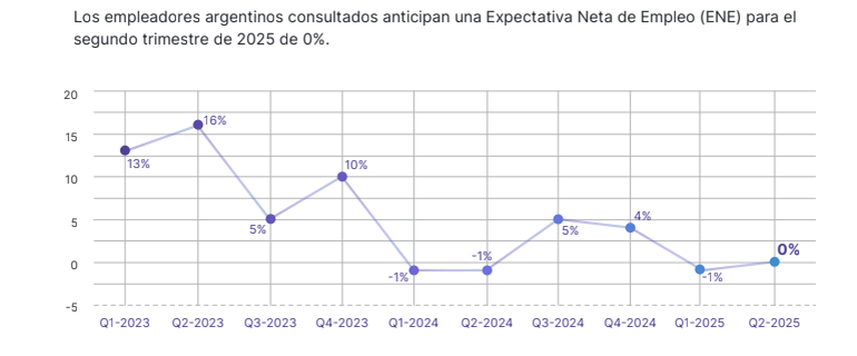 El informe se refiere a la tradicional encuesta de expectativas de empleo que lleva a cabo la consultora internacional, tanto a nivel local como internacional. Indica que las empresas consultadas “reportaron una Expectativa Neta de Empleo (ENE) de 0% ajustado por estacionalidad, demostrando un aumento de 1 punto porcentual tanto en la comparación trimestral, como en la interanual”.
