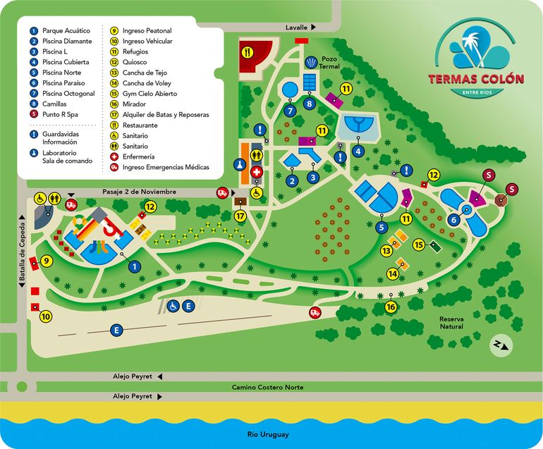 Este impresionante complejo termal instalado en un predio de 4,5 hectáreas a metros del Río Uruguay cuenta con cuatro sectores habilitados, 13 piscinas, divididas entre piletas cubiertas y al aire libre, una piscina octogonal, un área de descanso de 8 camas individuales y dos hidromasajes.