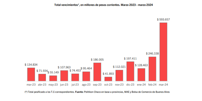 “En el tercer mes del 2024, provincias y CABA enfrentaron vencimientos de títulos públicos por un total de $593.657 millones (total pesificado que incluye vencimientos en moneda extranjera, convertido a su T.C correspondiente), un volumen que es 340,3% superior a lo operado en el mismo mes del 2023 y 141,0% superior al pasado mes de febrero”, puntualizó la consultora Politikon Chaco.