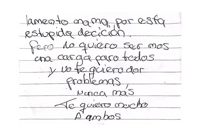 Antes de quitarse la vida, Gómez escribió una carta en la cual se despidió de su familia. “Lamento, mamá, por esta estúpida decisión. Pero no quiero ser más una carga para todos y no te quiero dar problemas nunca más. Te quiero mucho. A ambos”, escribió el joven de 21 años.