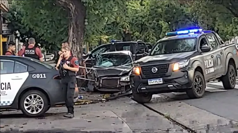 El fuerte impacto destrozó toda la parte delantera del vehículo. En ese momento, tres de los delincuentes descendieron del auto por la parte de atrás y se dieron a la fuga a pie en dirección al Barrio 15. En tanto, los dos menores de 13 y 15 años quedaron dentro del rodado.