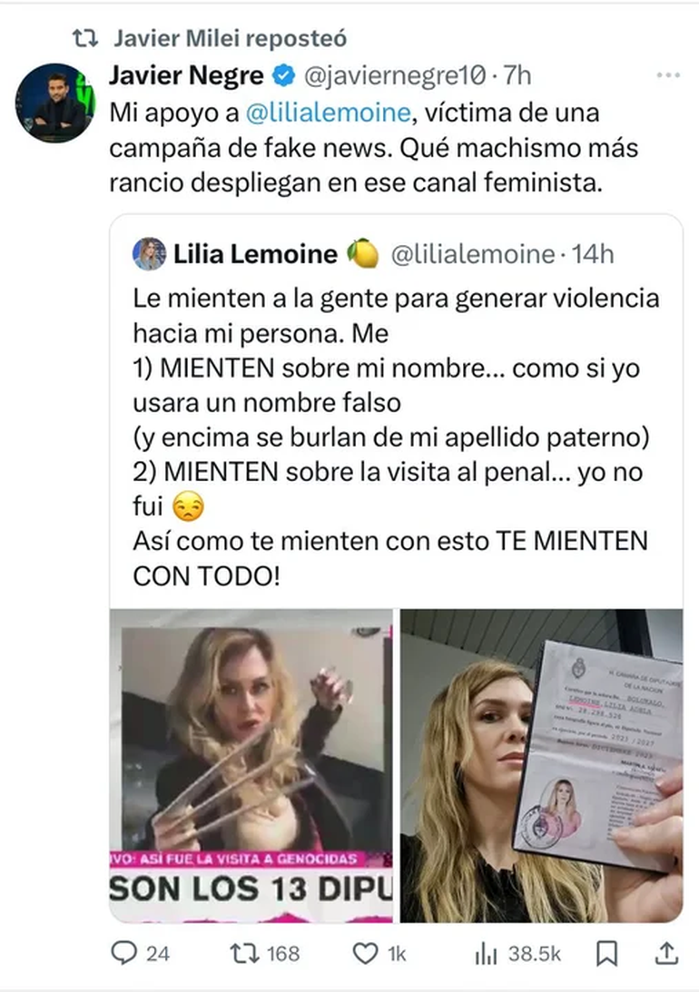 Milei salió en apoyo a la diputada de su partido con un retweet al periodista español Javier Negre, quien cito a la cosplayer y repudió lo dicho en C5N: “Mi apoyo a @Lilialemoine, víctima de una campaña de fake news. Qué machismo más rancio despliegan en ese canal feminista”.