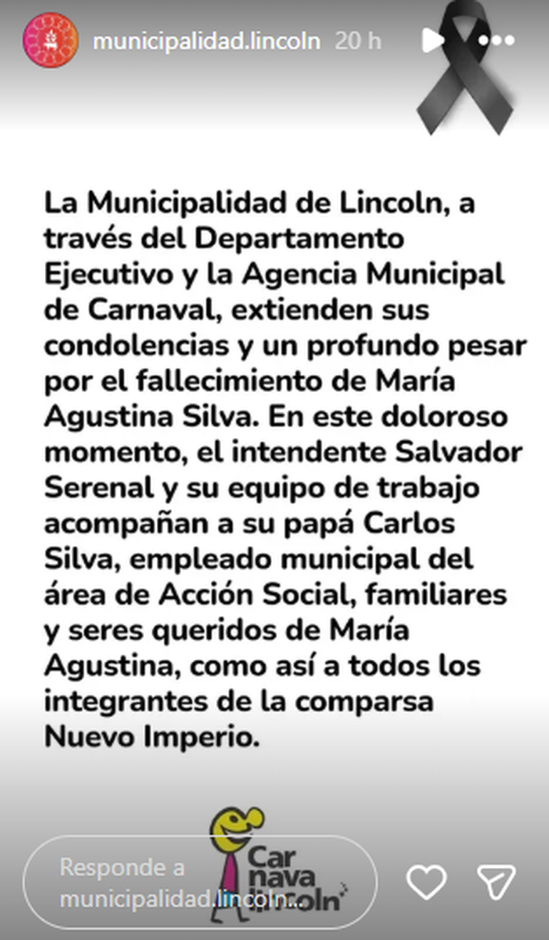 Desde la comparsa también se hicieron eco de la noticia y, a través de sus redes sociales, despidieron a Agustina y acompañaron a sus seres queridos.