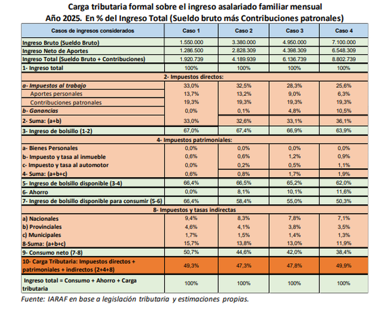 El estudio señala que “los casos 2 y 3 de ingresos, que tienen un ingreso total un 118% y un 219% más alto que el caso 1, respectivamente, tienen una carga entre 1,5 y 2 puntos porcentuales inferior”. “Por su parte, el caso 4, con un salario un 360% mayor que el del caso 1, tiene una carga tributaria solamente 0,6 puntos porcentuales más elevada”, advierte el estudio.