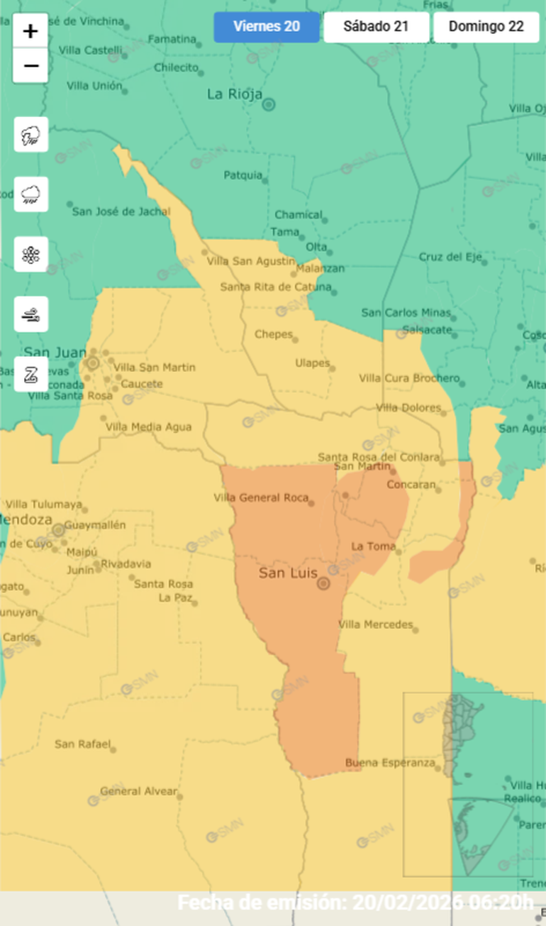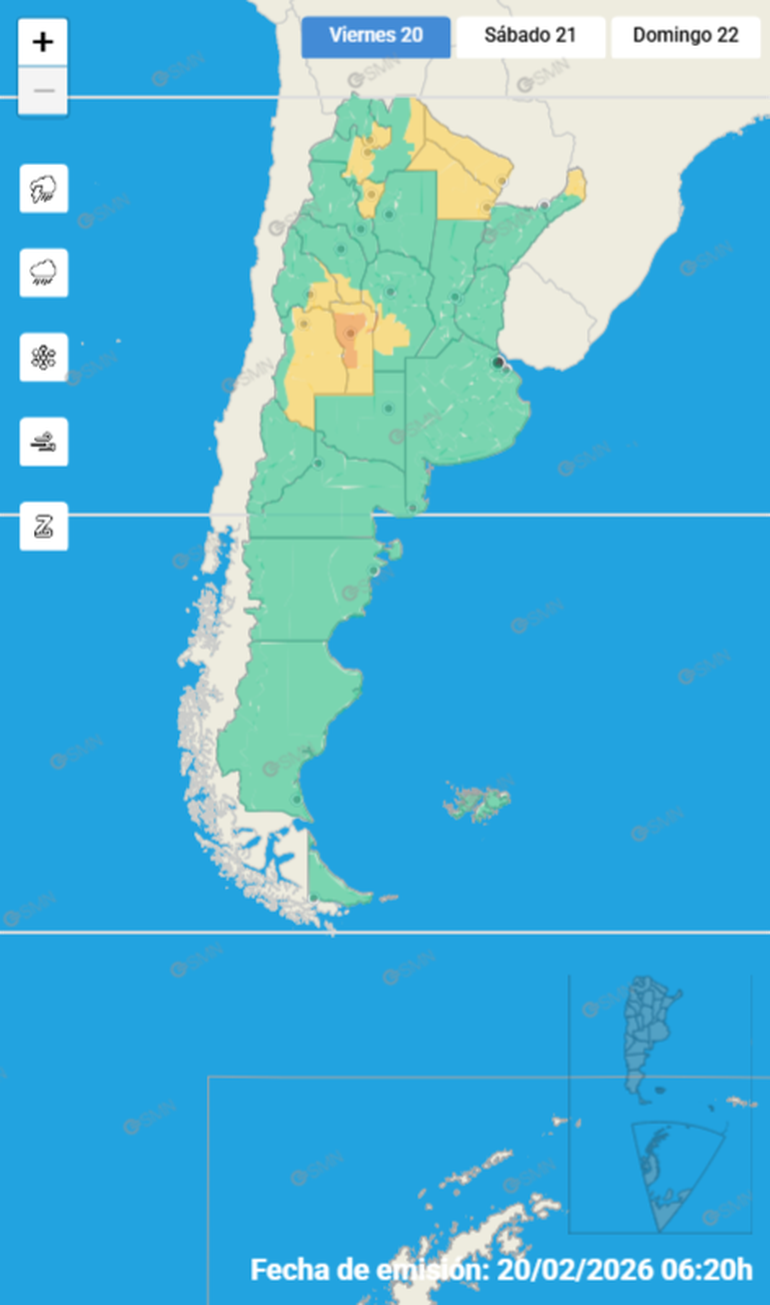 El Servicio Meteorológico Nacional (SMN) emitió una serie de alertas de nivel amarillo y naranja por tormentas intensas que se harán sentir este viernes 20 de febrero, pero además elevó a roja la alerta por temperaturas extremas de calor, también para esta jornada.
