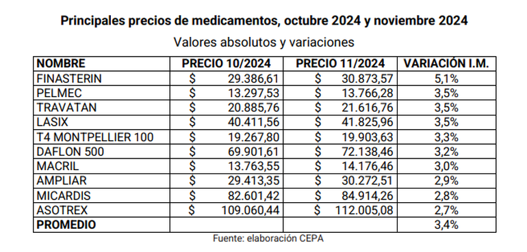 Según indica el reporte, estos medicamentos son "bienes de primera necesidad para gran parte de la población, especialmente para las personas mayores". De acuerdo con un recorte de la canasta que realizó el CEPA entre los 10 medicamentos más usados por el público la suba de precios del último mes fue del 3.4%.