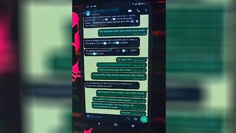 En las conversaciones que trascendieron se conoció que el gendarme escribió: “Estoy muy caliente por una nena de 7 años, ya me la chup... y me masturbó pero no pude más, quiero que te hagas pasar por ella”. Fue sólo el primero de una serie de mensajes en los que esa noche T.V. le contó a la joven que violaba sistemáticamente a su hijastra de 7 años. Hasta le confesó que la menor estaba ahí con él y le preguntó si no había problema en que se quedara a observar la videollamada.