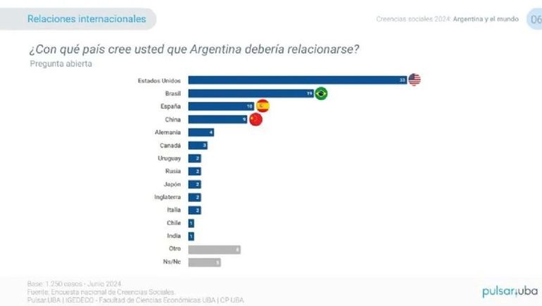 Cuando se les preguntó a los argentinos con qué país debería mantener una relación más estrecha, la mayoría de los encuestados eligió a Estados Unidos. Este país lidera el ranking, seguido por Brasil, España, China, Alemania, Canadá y Uruguay. Aunque la primacía de Estados Unidos y Brasil no presenta grandes cambios respecto al año anterior, se observan aumentos en las respuestas a favor de España y China.