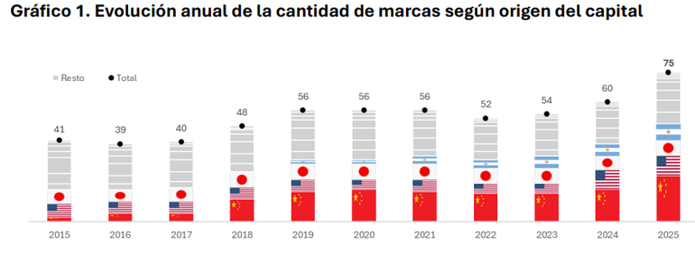 “En 2025, las marcas de origen chino acumularon más de 12 mil unidades patentadas, lo que representa un volumen casi cuatro veces superior al registrado en 2024”, dice el reporte conocido este viernes.