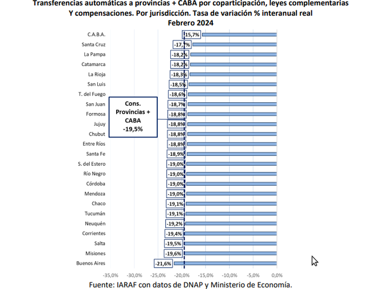 Por otro lado, visto a precios de febrero 2024, la pérdida de recursos para el consolidado de provincias y CABA fue por $ 566.082 millones respecto a febrero 2023.