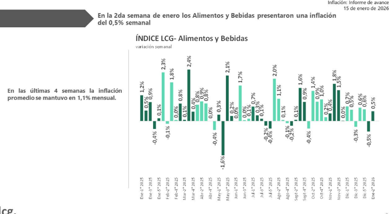 De acuerdo con la consultora LCG en la segunda semana de enero, el rubro Alimentos y Bebidas registró un incremento de precios de 0,5% respecto de la semana anterior. En tanto, en las últimas 4 semanas, la inflación promedio de este rubro fue del 1,1%.