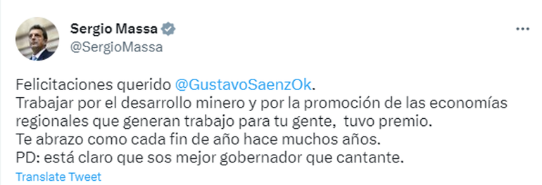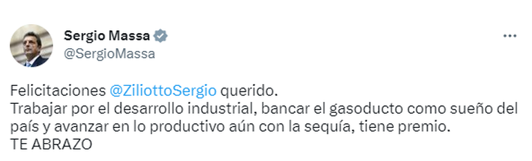 El ministro de Economía, Sergio Massa, saludó por Twitter al gobernador reelecto Sergio Ziliotto: “Felicitaciones @ZiliottoSergio querido. Trabajar por el desarrollo industrial, bancar el gasoducto como sueño del país y avanzar en lo productivo aún con la sequía, tiene premio”.