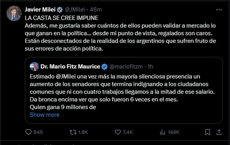 El libertario continuó con sus cuestionamientos y les recriminó no comprender que "el sueldo que perciben sale de los impuestos que pagan todos los argentinos". Además, subrayó que "obrar 9 millones de pesos en este contexto es más que una burla, es traición al pueblo trabajador". "Una vez más, la casta política se niega a soltar sus privilegios mientras el pueblo sufre las consecuencias", aseguró.