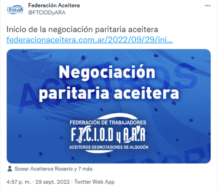 El gremio informó en un comunicado que "obtuvimos un logro colectivo de la mayor importancia y es gracias a la fuerza y convicción de las compañeras y compañeros trabajadores aceiteros, que se ha expresado contundentemente en cada ocasión en que fueron convocados".
