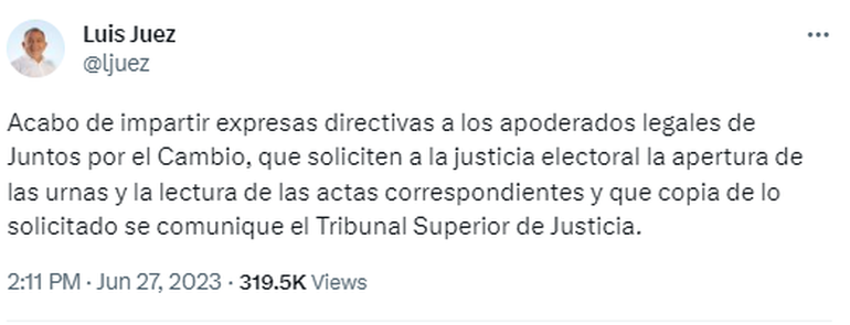 Por ese motivo, Juez remarcó: "Acabo de impartir expresas directivas a los apoderados legales de Juntos por el Cambio, que soliciten a la Justicia Electoral la apertura de las urnas y la lectura de las actas correspondientes y que copia de lo solicitado se comunique el Tribunal Superior de Justicia".