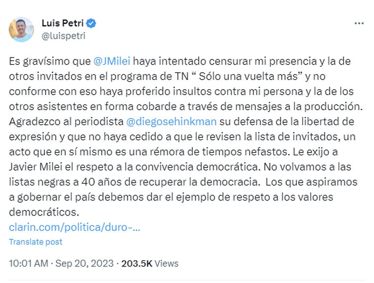 “Es gravísimo que Javier Milei haya intentado censurar mi presencia y la de otros invitados en el programa de TN ‘Solo una vuelta más’ y no conforme con eso haya proferido insultos contra mi persona y la de los otros asistentes en forma cobarde a través de mensajes a la producción”, opinó Petri a través de su cuenta de X (antes Twitter).