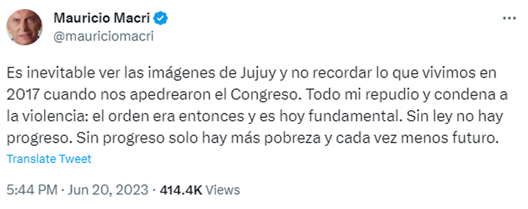 "Es inevitable ver las imágenes de Jujuy y no recordar lo que vivimos en 2017 cuando nos apedrearon el Congreso", señaló Macri en una publicación realizada en su cuenta de Twitter.