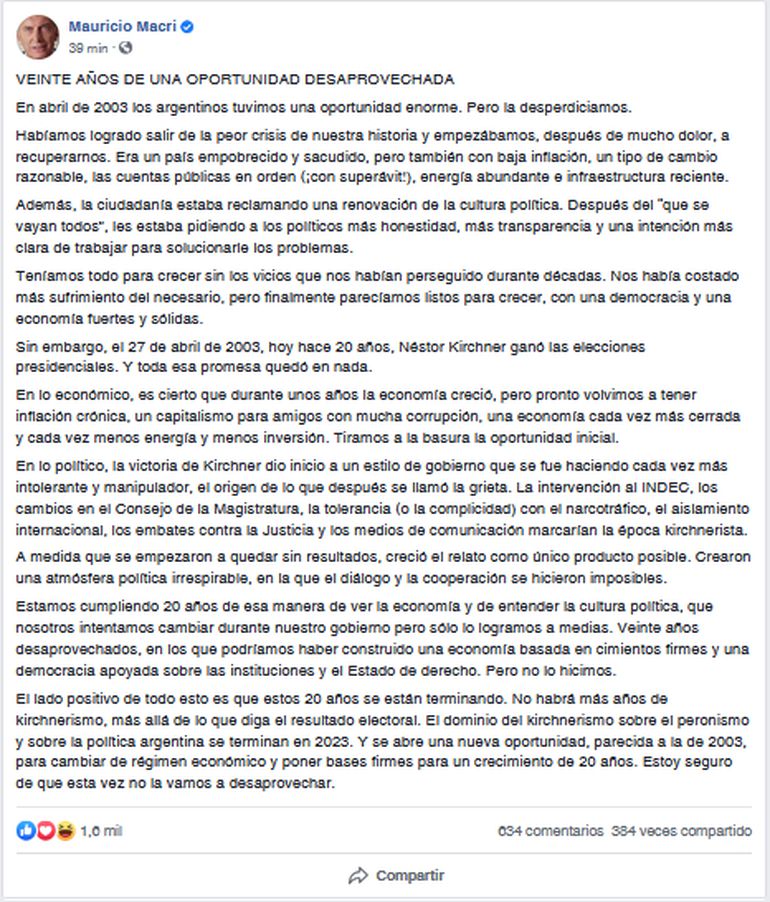 "El lado positivo de todo esto es que estos 20 años se están terminando. No habrá más años de kirchnerismo, más allá de lo que diga el resultado electoral. El dominio del kirchnerismo sobre el peronismo y sobre la política argentina se terminan en 2023. Y se abre una nueva oportunidad, parecida a la de 2003, para cambiar de régimen económico y poner bases firmes para un crecimiento de 20 años. Estoy seguro de que esta vez no la vamos a desaprovechar", concluyó el posteo el expresidente.